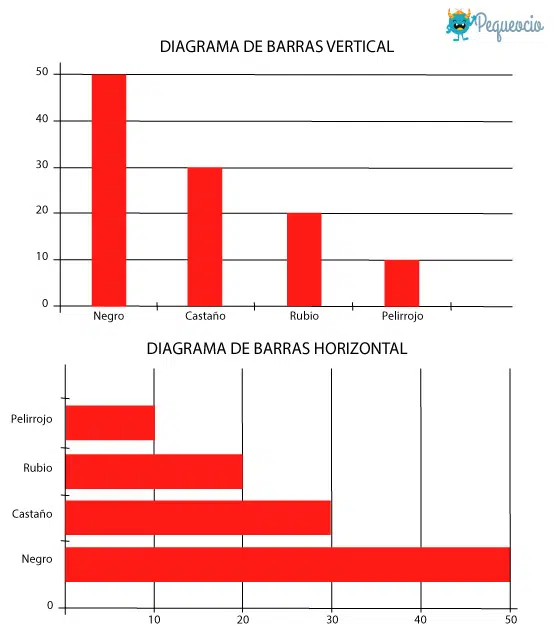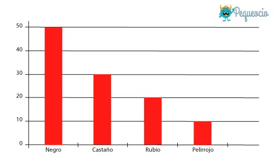 En el eje de ordenadas se colocan las barras proporcionales a la frecuencia del dato. La frecuencia es la cantidad de veces que la variable se repite durante un experimento. Pongamos un ejemplo: hacemos una encuesta a un grupo de 110 personas y les preguntamos su color de pelo; 50 nos responden que tienen el pelo negro, 30 castaño, 20 rubio y 10 son pelirrojos. Entonces tendremos que la frecuencia de la variable «negro» es 50; la de la variable «castaño» es 30, etc. El diagrama sería así: